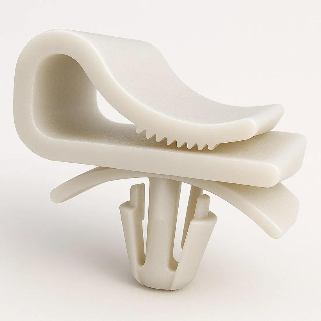 Clamp designed to hold flat cables tightly against surfaces, preventing movement and abrasion.