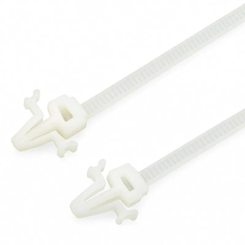 Cable ties with integrated push mount stems for snap-in attachment to pre-drilled panel holes.