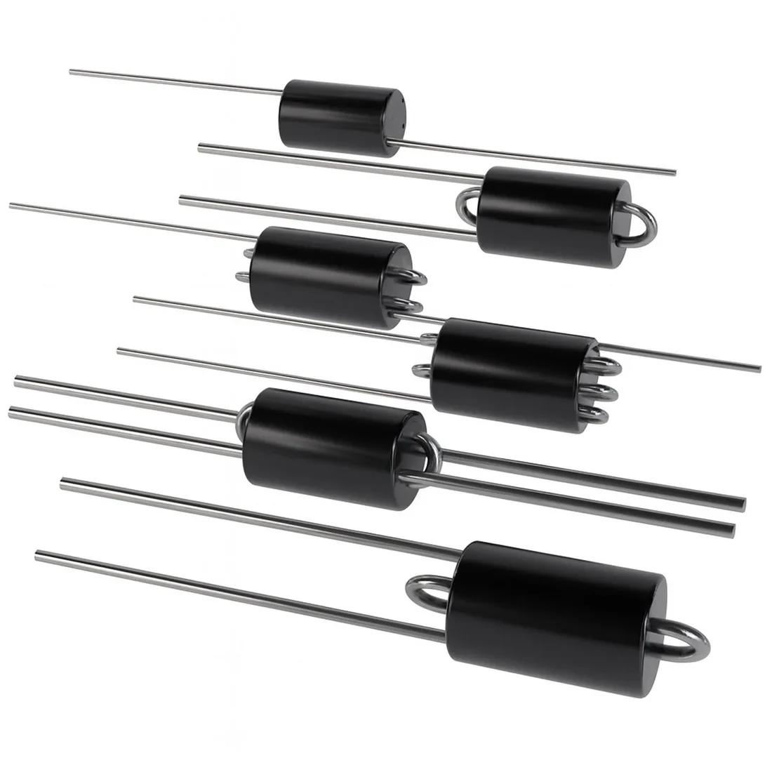 Small ferrite beads with wire wound around them. They act as miniature filters in circuits to reduce high-frequency noise and improve signal stability.