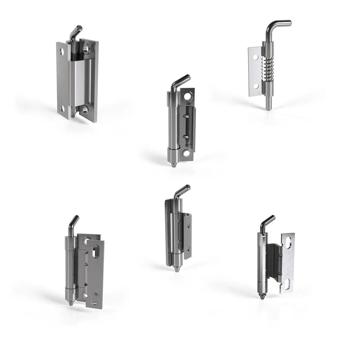 Left-hand and right-hand application is possible. Ideal for metal enclosures and machinery covers. Type 1-6: Hinge rotational angle of 120. Type 5: Frame part - screw on, door part - weld on. Type 7: Hinge rotational angle of 135. Type 8 and 9: Suitable for internally mounted doors.