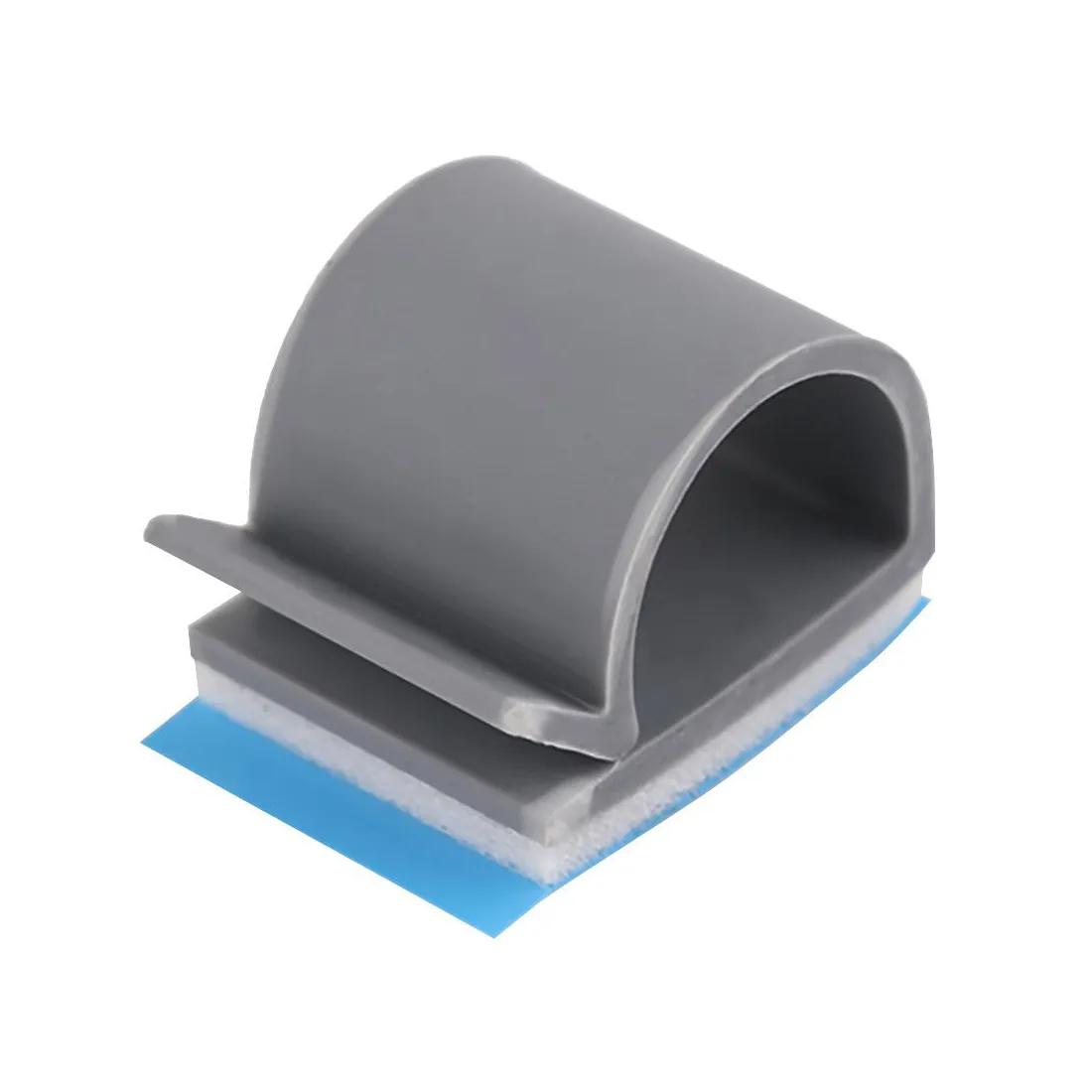 R-shaped adhesive clamp for securely routing and bundling cables against flat surfaces.